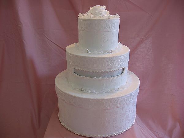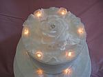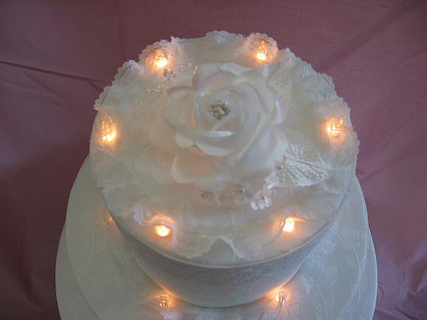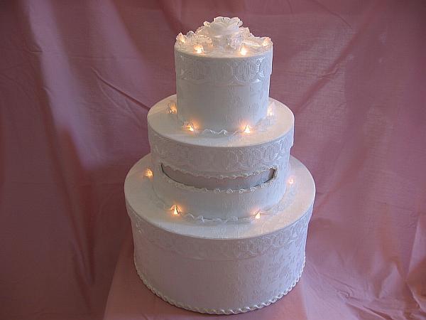 The ultimate wedding symbol--a gorgeous three-tier wedding card cake box. The box is covered in a tone on tone white satin fabric, and each tier is encircled with Battenburg lace. Twenty tiny white lights glow softly from beneath white lace trim. The "topper" is a white rose and faux pearl bouquet. The inside is painted white for a finished look. This would be a beautiful addition to your gift table. Four C batteries are included. The lights are operated by two switches inside the box.
